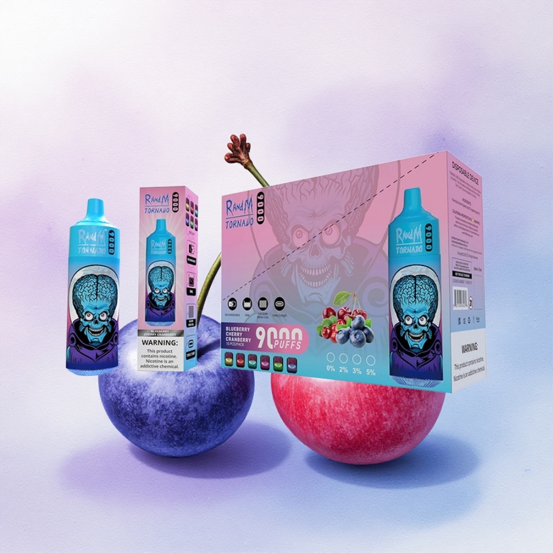 RandM Fumot Tornado 9000 Puffs Blåbær Kirsebær Tranebær 850 mAh 18 mL Mesh Coil